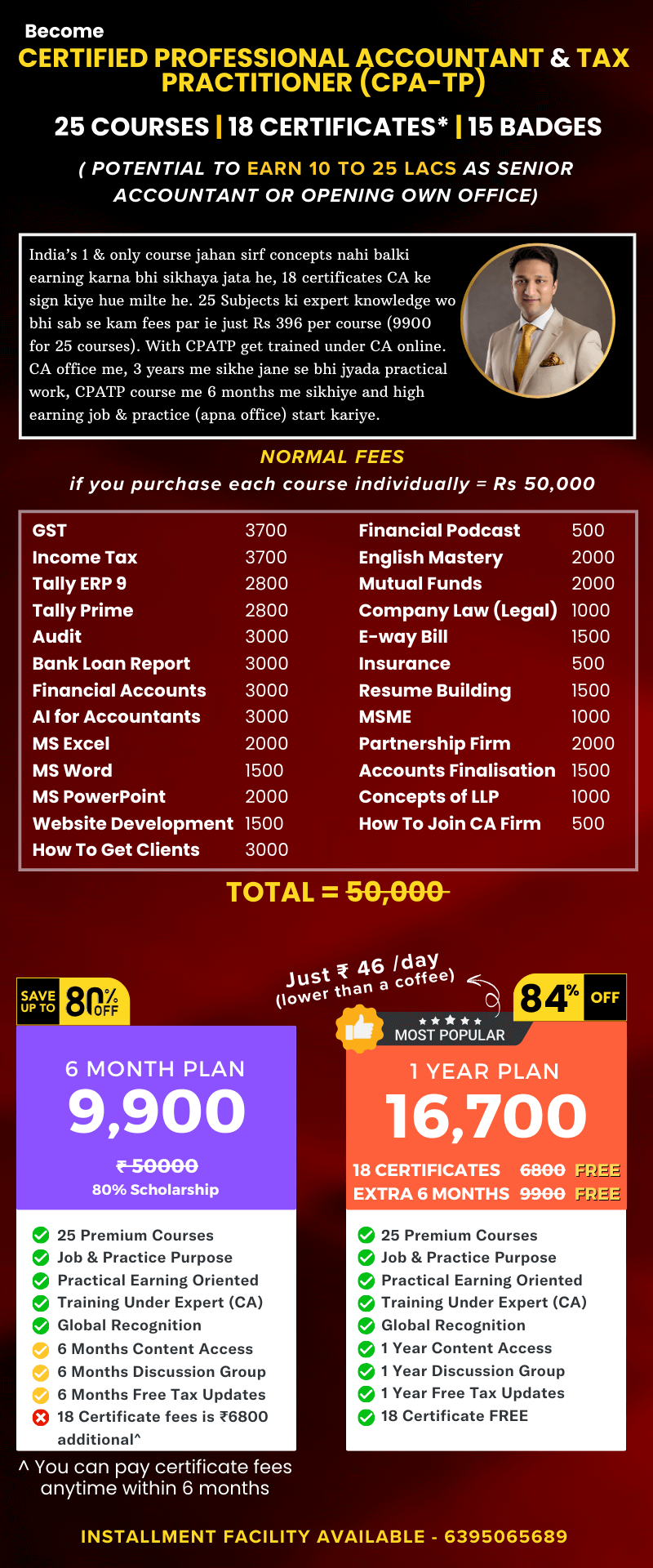 Course me theory or practical dono par bahut achhe se focus kiya hai so that aap 300-400 me return filing ka kam na kare. Ap ek achhe tax advisor ke jese 3000 - 5000 tak fees charge kar payein.