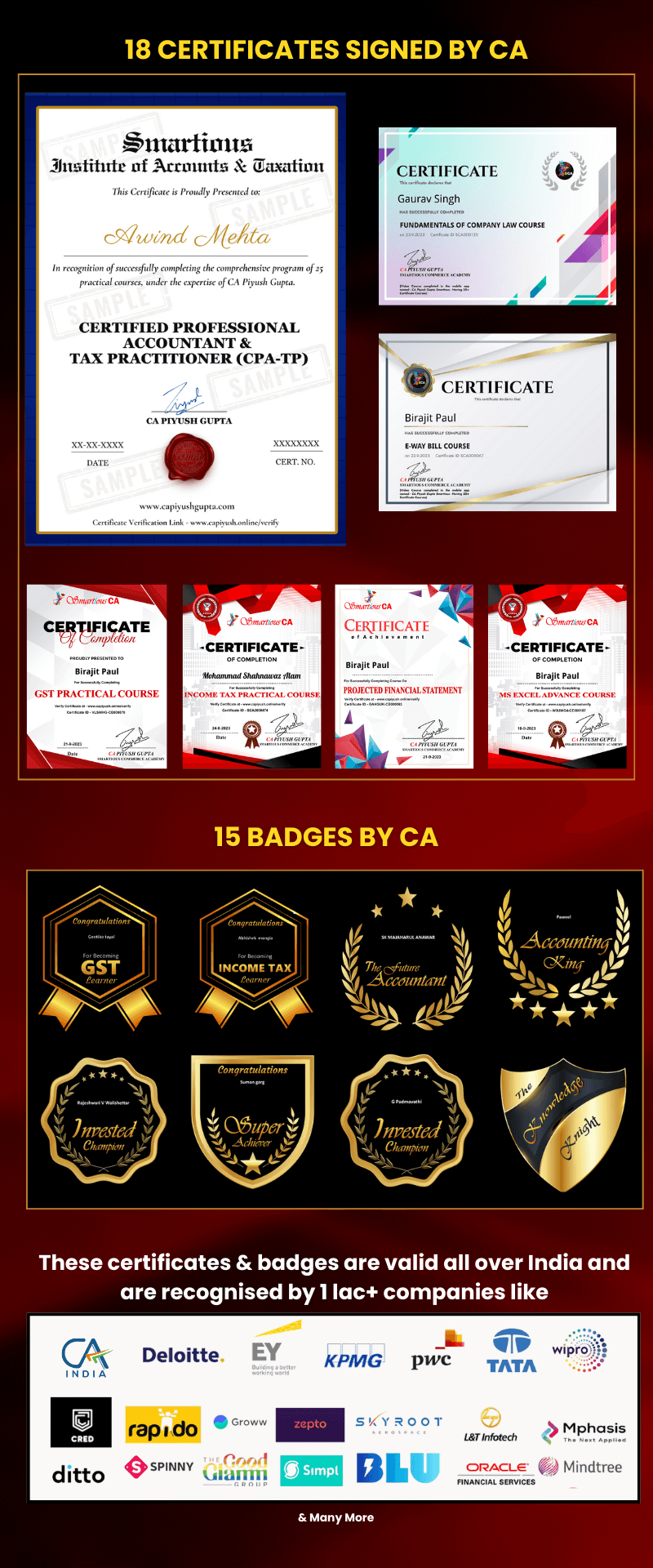 >> Do you know - Out of Rs 9900 fees, approx Rs 4000 goes to the government (18% GST & 30% Income Tax - depends on various factors) + hundreds of expenses like employees salary, softwares charges, server charges & office charges are separate. Our goal is to provide you the best learning at lowest possible price so that everyone can learn and earn. CPATP is India's lowest priced course which has 25 subjects by CA with indepth practical learning.